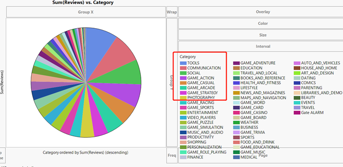 In order to clearly show how many reviews there are in each category of games, we need to create a new data table. Use the summary function and select the ‘Category’ variable in the Group, and select ‘Reviews’ in the data that needs statistics.