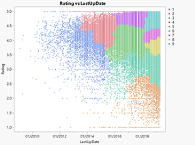 We apply Rating in y axis and use the previous saved cluster data to be color. The result is like the following pictures.